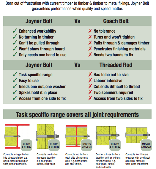 - The head of the Joyner bolt cannot be pulled into the timber due to the increased surface area, unlike coach bolts